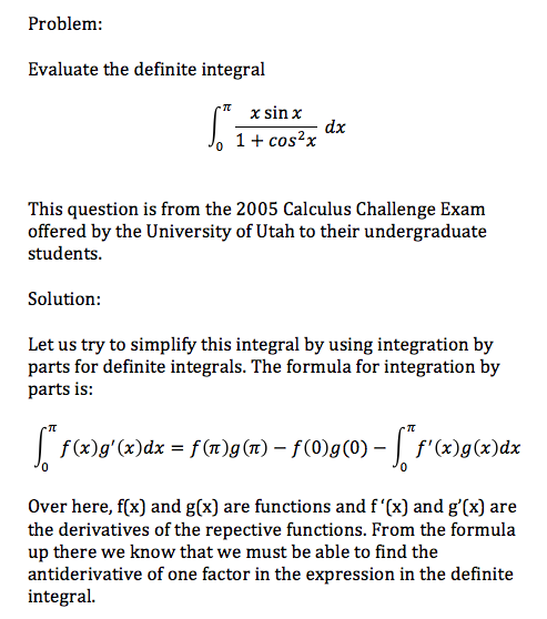 My name is Tanav. I am a ninth grade student who loves mathematics more than anything else in the world. I enjoy exploring various fields in mathematics like Calculus, Topology and Number theory. I prefer problems which stress logical and intuitive ability rather than the memorisation of formulae. I have started to conduct my own mathematical research which I am aiming to publish in a few months. I have always liked to challenge myself by doing extremely tough and interesting problems. I have succeeded in making some really intricate solutions to difficult problems from a variety of sources like the International Mathematical Olympiad (IMO) and the calculus challenge offered by the University of Utah to undergraduate students. I am looking forward to post my solutions to these problems on a regular basis. I welcome dialogue about these problems and would love any suggestions of problems at a similar difficulty level.